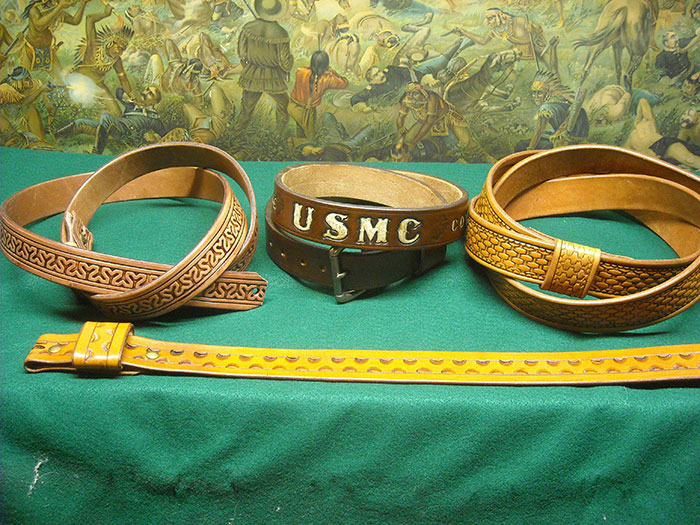 The following pictures show a small sample of the belts I make. Since I do not provide my belts through the internet the best way is to visit me at one of my shows (see the SCHEDULE to plan a trip) for a selection. I usually have a couple of dozen belts on display. They are not sized but when a customer buys one I then trim and size the belt to fit. After 8 years making belts I find this is the best way. I start with leather from the Hermann Oak Tannery (St. Louis, MO) and this great leather responds outstandingly to my work.