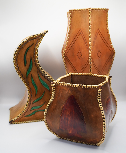 The following pictures show a small sample of the belts I make. Since I do not provide my belts through the internet the best way is to visit me at one of my shows (see the SCHEDULE to plan a trip) for a selection. I usually have a couple of dozen belts on display. They are not sized but when a customer buys one I then trim and size the belt to fit. After 8 years making belts I find this is the best way. I start with leather from the Hermann Oak Tannery (St. Louis, MO) and this great leather responds outstandingly to my work.